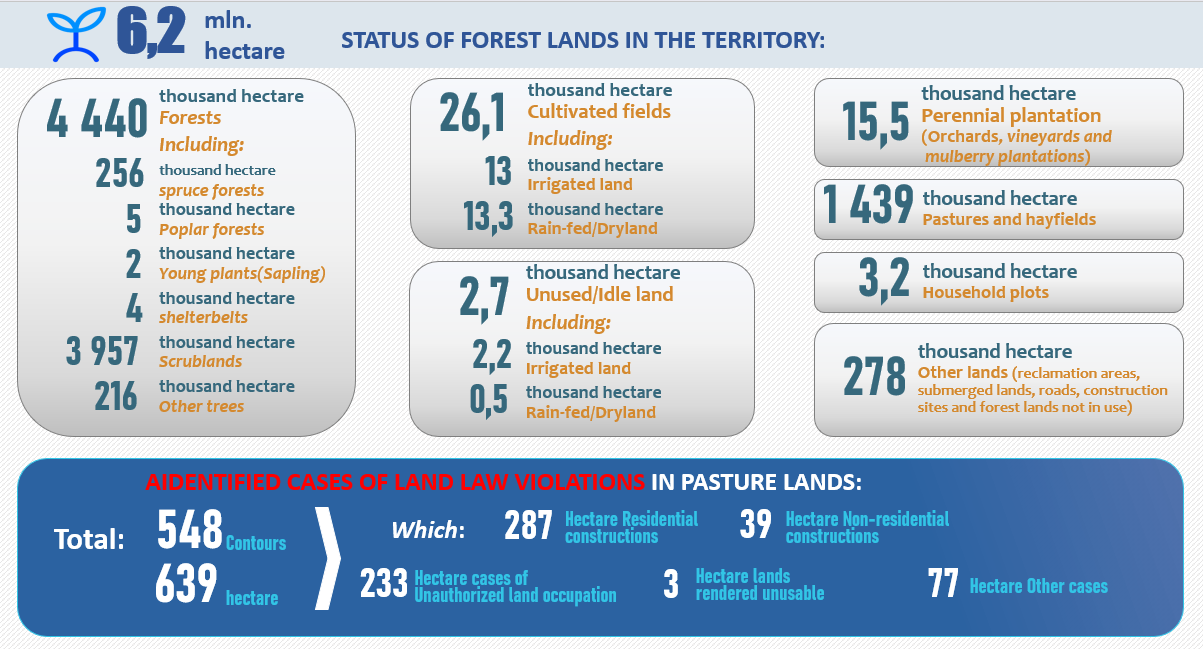 Understanding the current status of forest resources and their management structure is essential for evaluating the feasibility and strategic positioning of the nursery investments proposed under the RESILAND CA+ project. Uzbekistan is characterized by relatively low forest cover compared with many other regions; however, forest and tree-based ecosystems play a critical ecological, economic, and protective role across the country’s landscapes.
