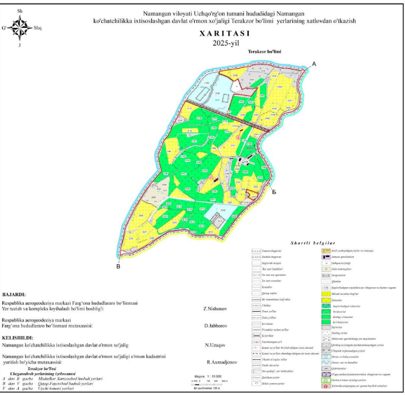 The spatial framework for nursery development in Namangan Region is defined by the Terakzor Division of the Namangan State Forestry Enterprise, located in Uchqo‘rg‘on District within the irrigated landscape of the Fergana Valley (Syr Darya basin). The division boundary is documented in the 2025 cadastral land-inventory map (“Terakzor bo‘limi yerlarining xatlovdan o‘tkazish xaritasi”, scale 1:10,000), prepared by the Republic Aerogeodesy Center – Fergana Interregional Branch and approved by the Namangan Forestry Enterprise. This map delineates the full management territory of the Terakzor Division and subdivides it into numbered compartments (predominantly 21xx–22xx series) used for forestry administration and land management.